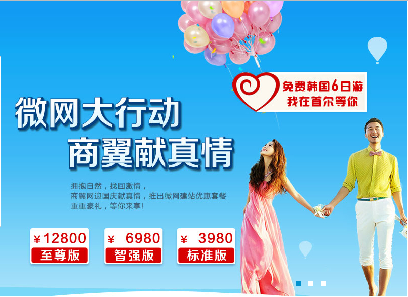 國慶黃金周即將到來,您是否準備好迎接的懷抱?擁抱自然,找回激情,商翼網(wǎng)國慶獻真情,推出微網(wǎng)建站優(yōu)惠及韓國6日游幫您重拾真實,盡享無限歡樂。精選套餐如下:方案一:12800元至尊版微網(wǎng)站套餐,您尊貴的選擇,可助您實現(xiàn)在線銷售、收款在線客服、宣傳及微信營銷的所有功能…